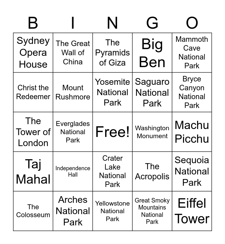 This bingo card has a free space and 37 words: Statue of Liberty, Grand Canyon, Yellowstone National Park, Mount Rushmore, Sequoia National Park, Independence Hall, Yosemite National Park, Lincoln Memorial, Mammoth Cave National Park, Gateway Arch, Everglades National Park, Big Ben, Eiffel Tower, Machu Picchu, Christ the Redeemer, Taj Mahal, Golden Gate Bridge, The Pyramids of Giza, Crater Lake National Park, Washington Monument, Sydney Opera House, Bryce Canyon National Park, The Colosseum, Yellowstone National Park, Joshua Tree National Park, Great Smoky Mountains National Park, The Great Wall of China, Hoover Dam, Wrangell–St. Elias National Park, Angkor Wat, Independence National Historical Park, Arches National Park, The Tower of London, Denali National Park, The Acropolis, Saguaro National Park and Hagia Sophia (Istanbul).