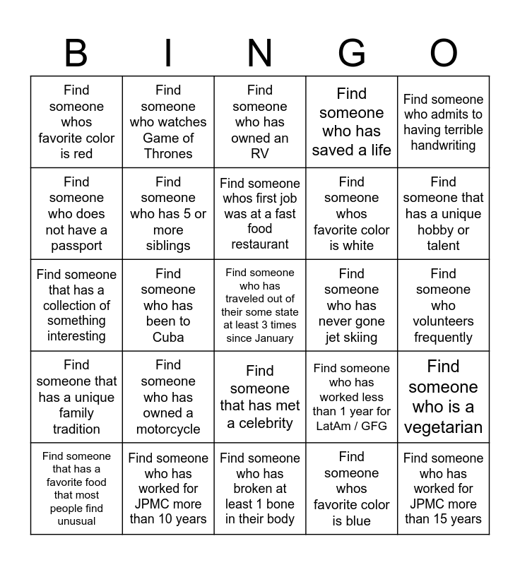 This bingo card has a free space and 49 words: Find someone who has worked for JPMC for less than 1 year, Find someone who has worked for JPMC more than 15 years, Find someone who shops at COSTCO, Find someone who has broken at least 1 bone in their body, Find someone who has owned a motorcycle, Find someone who played a varsity/college level sport, Find someone who watches Game of Thrones, Find someone who likes cats better than dogs, Find someone who does not have a passport, Find someone who has traveled to at least 4 countries, Find someone who has 5 or more siblings, Find someone who has saved a life, Find someone who is a vegetarian, Find someone who has worked less than 1 year for LatAm / GFG, Find someone that has run a marathon or participated in a major sporting event, Find someone whos favorite color is green, Find someone whos first job was at a fast food restaurant, Find someone who has never gone jet skiing, Find someone who loves to cook, Find someone who admits to having terrible handwriting, Find someone who has been to Cuba, Find someone whos favorite color is blue, Find someone whos favorite color is red, Find someone whos favorite color is white, Find someone that is an only child, Find someone that has a unique hobby or talent, Find someone that has a favorite food that most people find unusual, Find someone who has never been on a rollercoaster, Find someone that has met a celebrity, Find someone that has a unique family tradition, Find someone who does not have a passport, Find someone that has a hidden talent, Find someone that has worked in more than three different industries, Find someone that has a favorite place they visit regularly, Find someone who has worked for JPMC more than 10 years, Find someone that has multiple pets, Find someone that has a pet other than a cat or dog, Find someone who is afraid of heights, Find someone who volunteers frequently, Find someone that has a favorite book they've read more than once, Find someone that speaks more than 2 languages, Find someone who has never been to Disney, Find someone that has lived in a different country, Find someone who is left handed, Find someone that has a collection of something interesting, Find someone who has owned an RV, Find someone whos birthday is on a holiday, Find someone who loves to cook and Find someone who has a favorite movie from the 1980s or 90s.