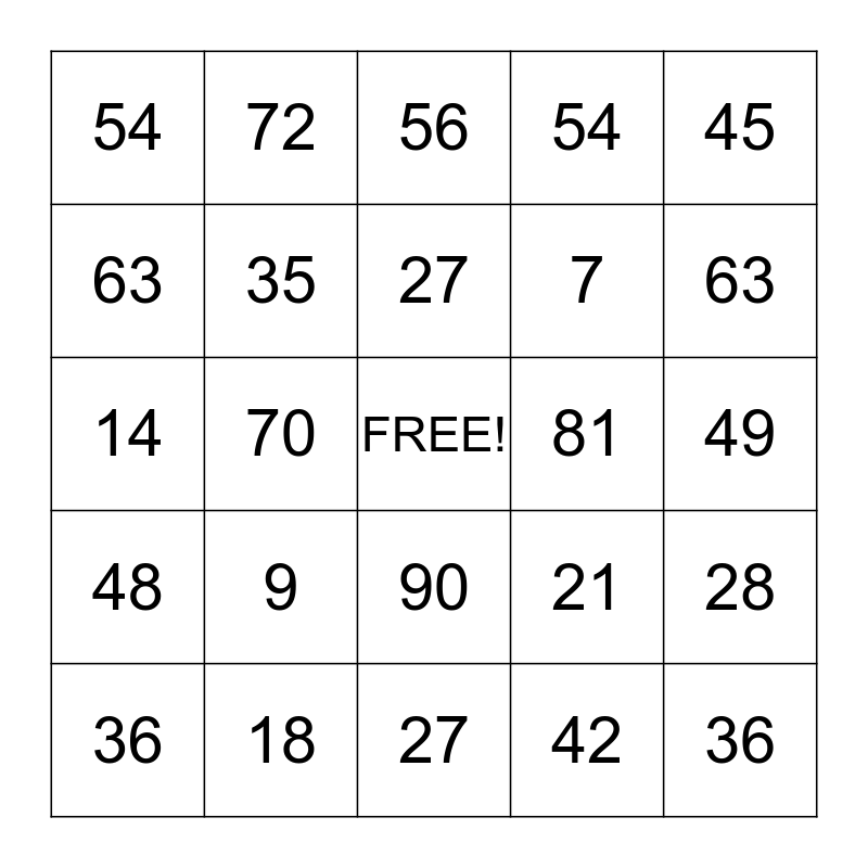 This bingo card has a free space and 24 words: 9, 18, 27, 36, 45, 54, 63, 72, 81, 90, 7, 14, 21, 28, 35, 42, 49, 56, 63, 70, 36, 48, 54 and 27.