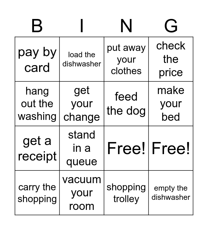 This bingo card has 32 words: Free!, Free!, Free!, clear the table, empty the dishwasher, feed the dog, hang out the washing, iron your T-shirt, load the dishwasher, load the washing machine, make your bed, put away your clothes, set the table, take out the rubbish, vacuum your room, water the plants, Free!, Free!, cashier, shopping bag, shopping basket, shopping list, shopping trolley, special offer, carry the shopping, check the price, get a receipt, get your change, pay by card, pay for the shopping, pay in cash and stand in a queue.