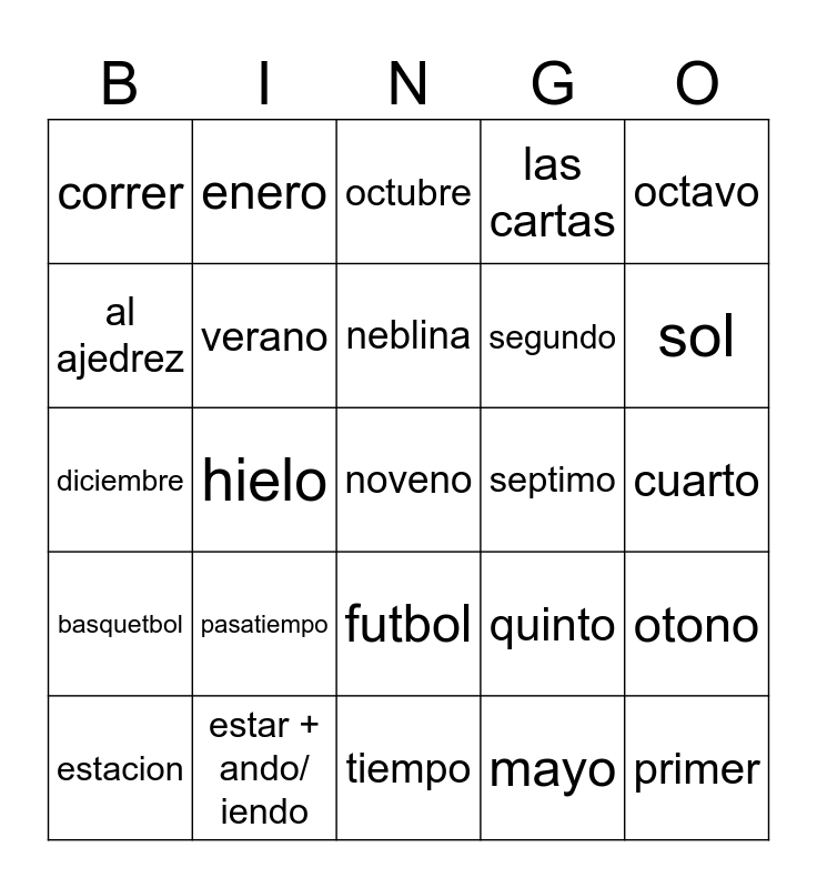 This bingo card has a free space and 54 words: beisbol, basquetbol, tenis, voleibol, futbol, futbol americano, las cartas, las damas, al ajedrez, esquiar, correr, hace + que, estar + ando/ iendo, estacion, mes, tiempo, primer, segundo, tercer, cuarto, quinto, sexto, septimo, octavo, decimo, enero, febrero, marzo, abril, mayo, junio, julio, agosto, septiembre, octubre, noviembre, diciembre, otono, primavera, verano, invierno, dor/dora, ista, equipo, pasatiempo, telenovela, nublado, viento, neblina, hielo, sol, calor, fresco and lluvia.
