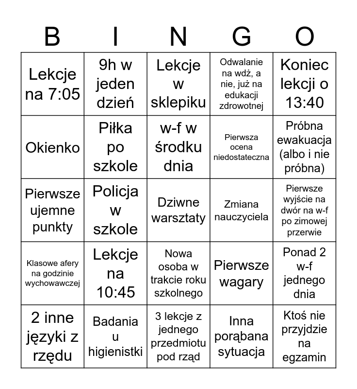 This bingo card has 25 words: Lekcje na 10:45, 3 lekcje z jednego przedmiotu pod rząd, w-f w środku dnia, 2 inne języki z rzędu, Koniec lekcji o 13:40, Lekcje na 7:05, Okienko, 9h w jeden dzień, Zmiana nauczyciela, Nowa osoba w trakcie roku szkolnego, Pierwsza ocena niedostateczna, Pierwsze ujemne punkty, Pierwsze wagary, Ponad 2 w-f jednego dnia, Piłka po szkole, Ktoś nie przyjdzie na egzamin, Pierwsze wyjście na dwór na w-f po zimowej przerwie, Lekcje w sklepiku, Próbna ewakuacja (albo i nie próbna), Policja w szkole, Dziwne warsztaty, Badania u higienistki, Klasowe afery na godzinie wychowawczej, Odwalanie na wdż, a nie, już na edukacji zdrowotnej and Inna porąbana sytuacja.