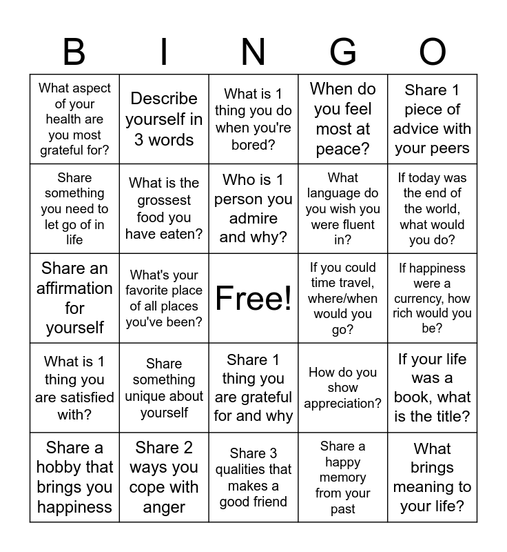 This bingo card has a free space and 24 words: Share something unique about yourself, Share 2 ways you cope with anger, Who is 1 person you admire and why?, Share a hobby that brings you happiness, Share 1 piece of advice with your peers, What aspect of your health are you most grateful for?, Share something you need to let go of in life, Describe yourself in 3 words, If you could time travel, where/when would you go?, Share 1 thing you are grateful for and why, What language do you wish you were fluent in?, Share an affirmation for yourself, How do you show appreciation?, If your life was a book, what is the title?, What is the grossest food you have eaten?, Share a happy memory from your past, If happiness were a currency, how rich would you be?, What is 1 thing you do when you're bored?, If today was the end of the world, what would you do?, What's your favorite place of all places you've been?, What brings meaning to your life?, What is 1 thing you are satisfied with?, When do you feel most at peace? and Share 3 qualities that makes a good friend.