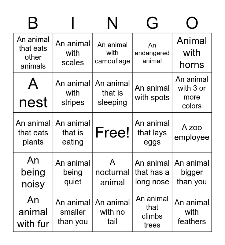 This bingo card has a free space and 28 words: An animal bigger than you, An animal with a long tail, An animal with spots, An animal that climbs trees, A nest, An animal with camouflage, An animal with scales, An being noisy, An animal that lays eggs, An animal with fur, An animal that eats plants, An endangered animal, An animal smaller than you, An animal with no tail, An animal with 3 or more colors, An animal that swims, An animal being quiet, An animal with stripes, An animal that is sleeping, A nocturnal animal, An animal that eats other animals, An animal that is hiding, An animal with feathers, An animal that is eating, A zoo employee, An animal that has a long nose, Animal with horns and A farm animal.