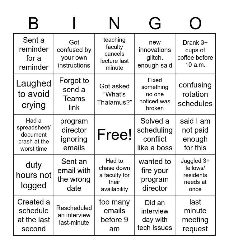 This bingo card has a free space and 24 words: Sent an email with the wrong date, Rescheduled an interview last-minute, Got asked “What’s Thalamus?”, Created a schedule at the last second, Drank 3+ cups of coffee before 10 a.m., Sent a reminder for a reminder, Laughed to avoid crying, Got confused by your own instructions, Solved a scheduling conflict like a boss, Had to chase down a faculty for their availability, Fixed something no one noticed was broken, Had a spreadsheet/ document crash at the worst time, wanted to fire your program director, Juggled 3+ fellows/ residents needs at once, Forgot to send a Teams link, Did an interview day with tech issues, said I am not paid enough for this, teaching faculty cancels lecture last minute, confusing rotation schedules, program director ignoring emails, last minute meeting request, duty hours not logged, new innovations glitch. enough said and too many emails before 9 am.