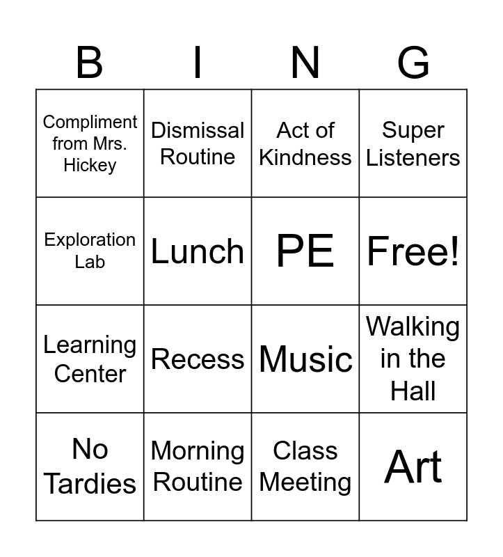 This bingo card has 17 words: Class Meeting, No Tardies, Act of Kindness, Compliment from Mrs. Hickey, Recess, Super Listeners, Walking in the Hall, PE, Free!, Lunch, Morning Routine, Music, Exploration Lab, Dismissal Routine, Learning Center, Compliment from Mrs. Bird and Art.