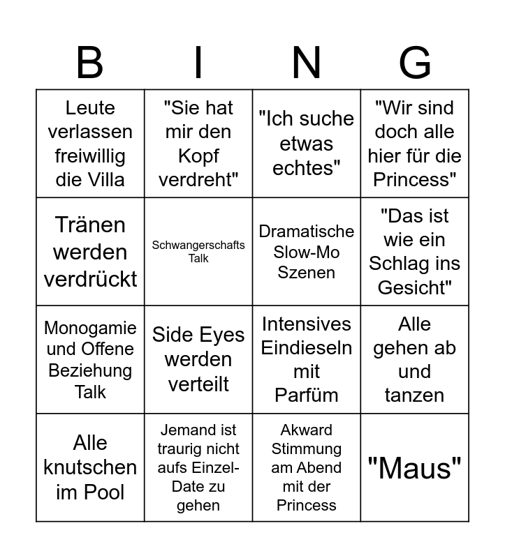 This bingo card has 16 words: Alle knutschen im Pool, Jemand ist traurig nicht aufs Einzel-Date zu gehen, "Ich suche etwas echtes", "Wir sind doch alle hier für die Princess", Tränen werden verdrückt, "Sie hat mir den Kopf verdreht", Intensives Eindieseln mit Parfüm, Alle gehen ab und tanzen, Leute verlassen freiwillig die Villa, Schwangerschafts Talk, Akward Stimmung am Abend mit der Princess, "Das ist wie ein Schlag ins Gesicht", Monogamie und Offene Beziehung Talk, Side Eyes werden verteilt, Dramatische Slow-Mo Szenen and "Maus".