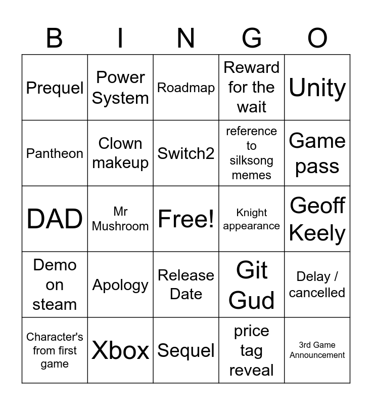 This bingo card has a free space and 24 words: Apology, Xbox, Switch2, Character's from first game, Unity, Prequel, Pantheon, Power System, Knight appearance, Release Date, reference to silksong memes, DAD, Git Gud, Delay / cancelled, Clown makeup, price tag reveal, Geoff Keely, Roadmap, Game pass, Mr Mushroom, 3rd Game Announcement, Demo on steam, Reward for the wait and Sequel.