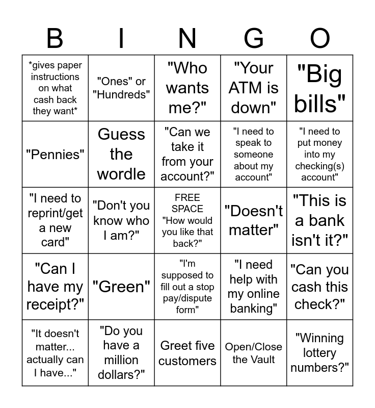 This bingo card has a free space and 24 words: "Green", "Do you have a million dollars?", "Can we take it from your account?", "It doesn't matter... actually can I have...", "Big bills", *gives paper instructions on what cash back they want*, "Pennies", "Ones" or "Hundreds", "Doesn't matter", "I'm supposed to fill out a stop pay/dispute form", "I need to speak to someone about my account", "I need to reprint/get a new card", "I need help with my online banking", "Can you cash this check?", Guess the wordle, Open/Close the Vault, "This is a bank isn't it?", "Who wants me?", "I need to put money into my checking(s) account", "Don't you know who I am?", "Winning lottery numbers?", "Can I have my receipt?", "Your ATM is down" and Greet five customers.