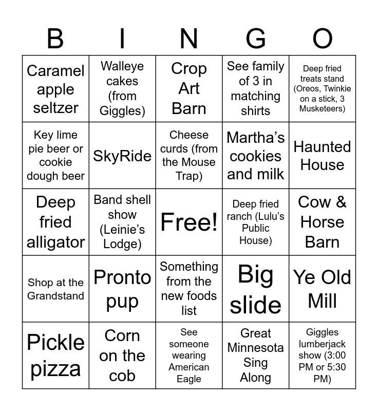 This bingo card has a free space and 24 words: Pronto pup, Corn on the cob, Cheese curds (from the Mouse Trap), Pickle pizza, Deep fried treats stand (Oreos, Twinkie on a stick, 3 Musketeers), Caramel apple seltzer, Key lime pie beer or cookie dough beer, Walleye cakes (from Giggles), Deep fried ranch (Lulu’s Public House), Something from the new foods list, Martha’s cookies and milk, Deep fried alligator, Big slide, Ye Old Mill, SkyRide, Great Minnesota Sing Along, Cow & Horse Barn, Crop Art Barn, Haunted House, Band shell show (Leinie’s Lodge), Giggles lumberjack show (3:00 PM or 5:30 PM), Shop at the Grandstand, See family of 3 in matching shirts and See someone wearing American Eagle.