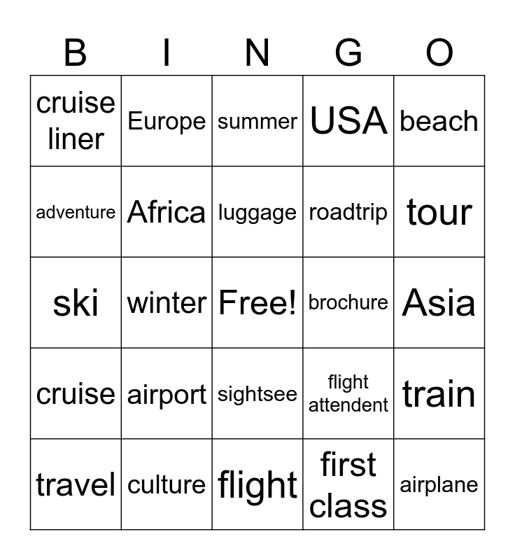 This bingo card has a free space and 24 words: travel, airport, luggage, first class, beach, cruise liner, Europe, summer, brochure, Asia, ski, Africa, flight attendent, train, adventure, culture, flight, USA, tour, cruise, winter, sightsee, roadtrip and airplane.