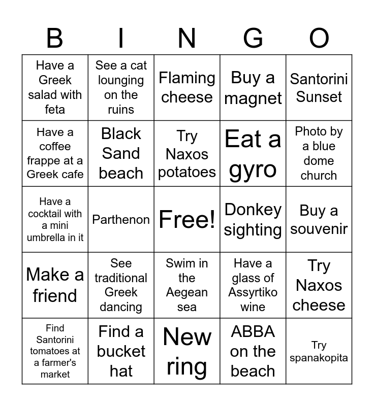 This bingo card has a free space and 24 words: See traditional Greek dancing, Find a bucket hat, Try Naxos potatoes, Find Santorini tomatoes at a farmer's market, Santorini Sunset, Have a Greek salad with feta, Have a coffee frappe at a Greek cafe, See a cat lounging on the ruins, Donkey sighting, Swim in the Aegean sea, Eat a gyro, Have a cocktail with a mini umbrella in it, Have a glass of Assyrtiko wine, Try Naxos cheese, Black Sand beach, ABBA on the beach, Buy a souvenir, Flaming cheese, Photo by a blue dome church, Parthenon, Try spanakopita, Make a friend, Buy a magnet and New ring.