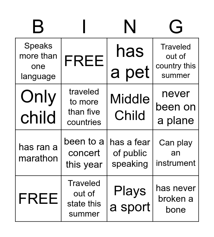 This bingo card has 16 words: Traveled out of state this summer, Can play an instrument, has a pet, Speaks more than one language, has ran a marathon, FREE, has a fear of public speaking, Plays a sport, Only child, traveled to more than five countries, FREE, Traveled out of country this summer, been to a concert this year, never been on a plane, Middle Child and has never broken a bone.