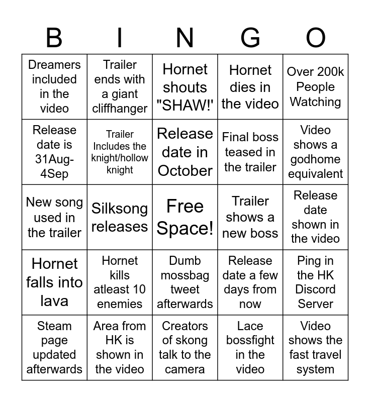 This bingo card has a free space and 24 words: Hornet kills atleast 10 enemies, Area from HK is shown in the video, Release date in October, Steam page updated afterwards, Over 200k People Watching, Dreamers included in the video, Release date is 31Aug-4Sep, Trailer ends with a giant cliffhanger, Trailer shows a new boss, Dumb mossbag tweet afterwards, Final boss teased in the trailer, New song used in the trailer, Release date a few days from now, Ping in the HK Discord Server, Trailer Includes the knight/hollow knight, Lace bossfight in the video, Release date shown in the video, Hornet shouts "SHAW!', Video shows a godhome equivalent, Silksong releases, Video shows the fast travel system, Hornet falls into lava, Hornet dies in the video and Creators of skong talk to the camera.