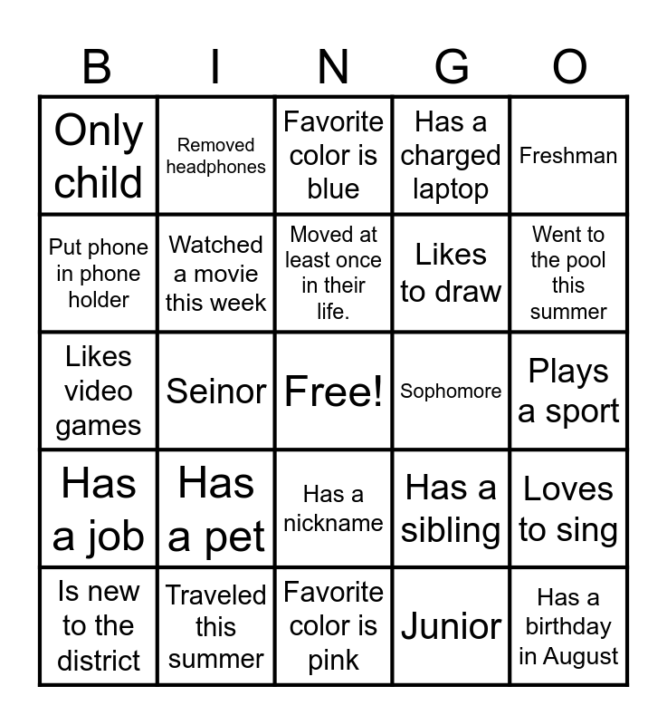 This bingo card has a free space and 24 words: Has a pet, Traveled this summer, Moved at least once in their life., Is new to the district, Freshman, Only child, Put phone in phone holder, Removed headphones, Sophomore, Has a nickname, Likes to draw, Likes video games, Has a sibling, Loves to sing, Watched a movie this week, Junior, Plays a sport, Favorite color is blue, Went to the pool this summer, Seinor, Has a birthday in August, Has a job, Has a charged laptop and Favorite color is pink.