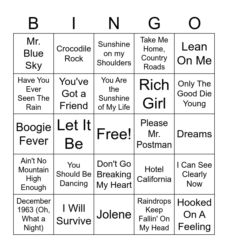 This bingo card has a free space and 32 words: Raindrops Keep Fallin' On My Head, I Want You Back, Let It Be, ABC, Ain't No Mountain High Enough, You've Got a Friend, Lean On Me, I Can See Clearly Now, Crocodile Rock, Superstition, You Are the Sunshine of My Life, Sunshine on my Shoulders, You Ain't Seen Nothing Yet, Cat's in the Cradle, Please Mr. Postman, Best of My Love, December 1963 (Oh, What a Night), Boogie Fever, Don't Go Breaking My Heart, You Should Be Dancing, Hotel California, Sir Duke, Dreams, I Will Survive, Hooked On A Feeling, Take Me Home, Country Roads, Rich Girl, Have You Ever Seen The Rain, Mr. Blue Sky, Jolene, Three Little Birds and Only The Good Die Young.