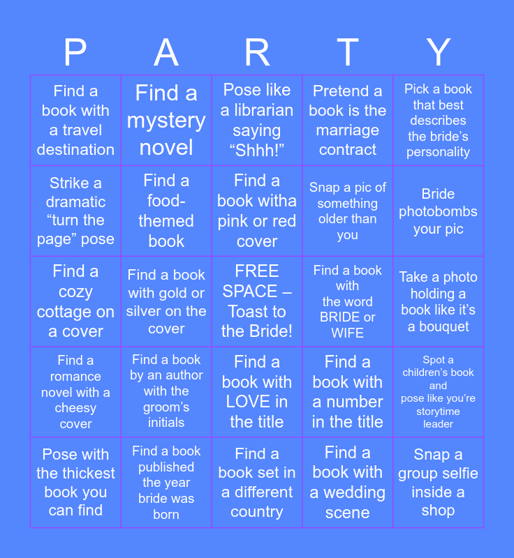 This bingo card has a free space and 24 words: Find a book by an author with the groom’s initials, Find a book published the year bride was born, Find a book witha pink or red cover, Pose with the thickest book you can find, Pick a book that best describes the bride’s personality, Find a book with a travel destination, Strike a dramatic “turn the page” pose, Find a mystery novel, Find a book with the word BRIDE or WIFE, Find a book with LOVE in the title, Snap a pic of something older than you, Find a cozy cottage on a cover, Find a book with a number in the title, Spot a children’s book and pose like you’re storytime leader, Find a food-themed book, Find a book with a wedding scene, Take a photo holding a book like it’s a bouquet, Pose like a librarian saying “Shhh!”, Bride photobombs your pic, Find a book with gold or silver on the cover, Snap a group selfie inside a shop, Find a romance novel with a cheesy cover, Pretend a book is the marriage contract and Find a book set in a different country.