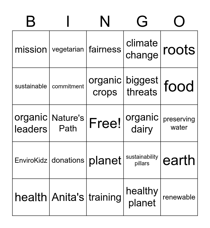 This bingo card has a free space and 48 words: organic, renewable, energy, training, donations, volunteer, vegetarian, zero waste, sustainable, regenerative organic, commitment, climate change, earth, sustainability pillars, give back, pesticide, organic crops, organic dairy, organic farmers, roots, Nature's Path, healthy planet, mission, biggest threats, natural methods, food, health, biodiversity, planet, EnviroKidz, Monarch Magic, GMO, Pesticides, Into the weeds, Anita's, Love Child Organic, Reducing waste, preserving water, educating, communities, health, ecology, fairness, care, organic leaders, healthy soil, healthy planet and healthy people.