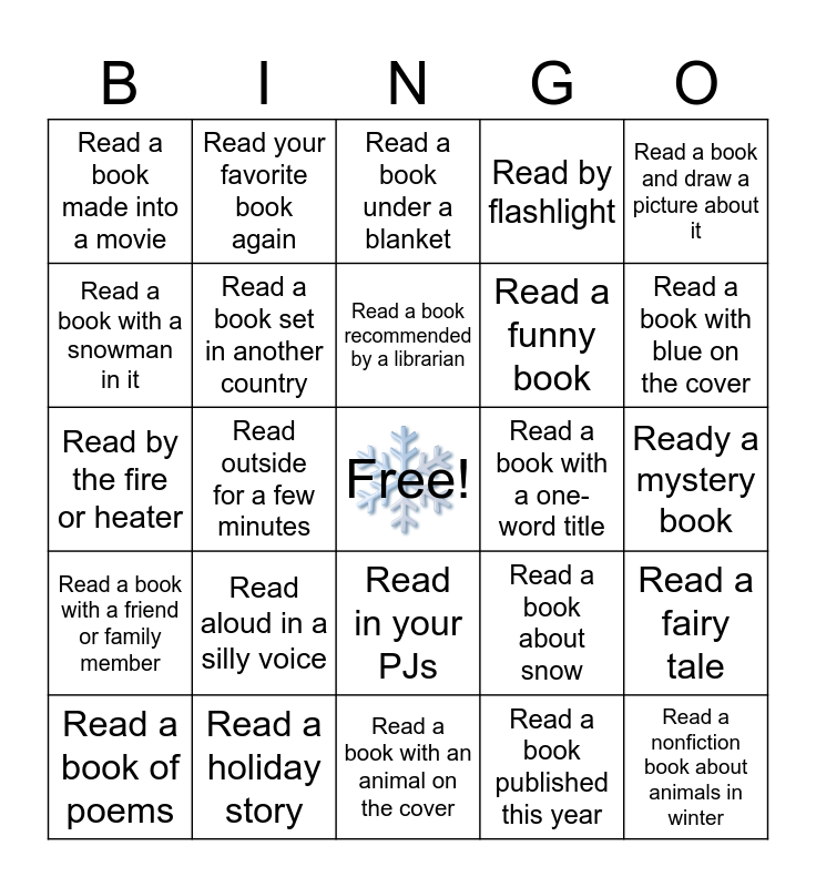 This bingo card has a free space and 24 words: Read aloud in a silly voice, Read a holiday story, Read a book recommended by a librarian, Read a book of poems, Read a book and draw a picture about it, Read a book made into a movie, Read a book with a snowman in it, Read your favorite book again, Read a book with a one-word title, Read in your PJs, Read a funny book, Read by the fire or heater, Read a book about snow, Read a fairy tale, Read a book set in another country, Read a book published this year, Ready a mystery book, Read a book under a blanket, Read a book with blue on the cover, Read outside for a few minutes, Read a nonfiction book about animals in winter, Read a book with a friend or family member, Read by flashlight and Read a book with an animal on the cover.
