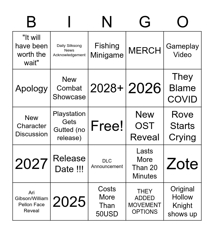 This bingo card has a free space and 24 words: Release Date !!!, 2025, 2028+, Ari Gibson/William Pellon Face Reveal, Gameplay Video, "It will have been worth the wait", Apology, Daily Silksong News Acknowledgement, New OST Reveal, DLC Announcement, 2026, New Character Discussion, Lasts More Than 20 Minutes, Zote, New Combat Showcase, THEY ADDED MOVEMENT OPTIONS, Rove Starts Crying, Fishing Minigame, They Blame COVID, Playstation Gets Gutted (no release), Original Hollow Knight shows up, 2027, MERCH and Costs More Than 50USD.