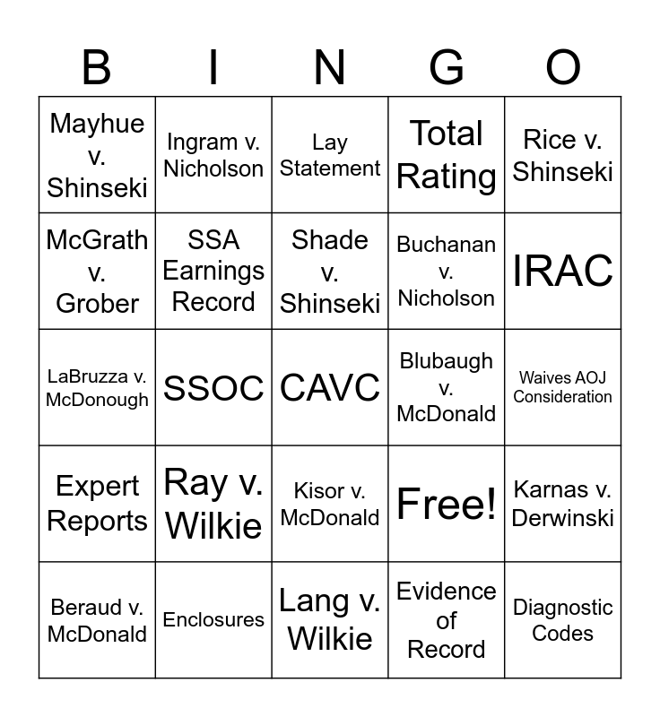 This bingo card has 25 words: Ray v. Wilkie, Lang v. Wilkie, Shade v. Shinseki, Beraud v. McDonald, Rice v. Shinseki, Mayhue v. Shinseki, McGrath v. Grober, Ingram v. Nicholson, Blubaugh v. McDonald, Kisor v. McDonald, Buchanan v. Nicholson, LaBruzza v. McDonough, Free!, Karnas v. Derwinski, SSA Earnings Record, Diagnostic Codes, Waives AOJ Consideration, Lay Statement, IRAC, SSOC, CAVC, Enclosures, Expert Reports, Total Rating and Evidence of Record.
