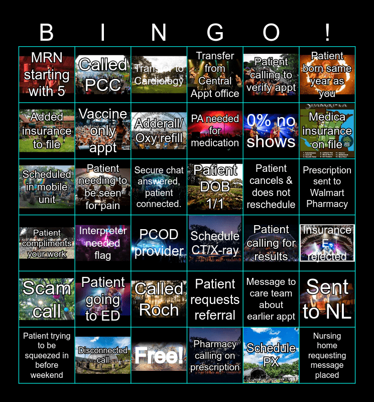 This bingo card has 30 images and 36 words: Patient requests referral, Called Roch, Pharmacy calling on prescription, Added insurance to file, Patient compliments your work, Patient DOB 1/1, Vaccine only appt, Free!, Patient calling to verify appt, Message to care team about earlier appt, Medica insurance on file, Transfer from Central Appt office, Sent to NL, Patient needing to be seen for pain, PA needed for medication, MRN starting with 5, Scam call, Patient cancels & does not reschedule, Scheduled in mobile unit, Transfer to Cardiology, Secure chat answered, patient connected., Interpreter needed flag, Schedule CT/X-ray, PCOD provider, Patient calling for results, Called PCC, 0% no shows, Disconnected call, Adderall/ Oxy refill, Patient born same year as you, Nursing home requesting message placed, Patient trying to be squeezed in before weekend, Insurance E-rejected, Prescription sent to Walmart Pharmacy, Patient going to ED and Schedule PX.