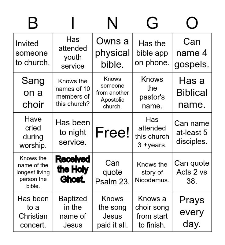 This bingo card has a free space and 24 words: Received the Holy Ghost., Baptized in the name of Jesus, Knows someone from another Apostolic church., Has been to a Christian concert., Can name 4 gospels., Invited someone to church., Sang on a choir, Has attended youth service, Has attended this church 3 +years., Can quote Psalm 23., Knows the pastor's name., Have cried during worship., Knows the story of Nicodemus., Can quote Acts 2 vs 38., Knows the names of 10 members of this church?, Knows a choir song from start to finish., Can name at-least 5 disciples., Owns a physical bible., Has a Biblical name., Has been to night service., Prays every day., Knows the name of the longest living person the bible., Has the bible app on phone. and Knows the song Jesus paid it all..