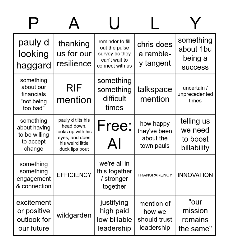 This bingo card has a free space and 24 words: EFFICIENCY, wildgarden, something something difficult times, excitement or positive outlook for our future, something about 1bu being a success, pauly d looking haggard, something about our financials "not being too bad", thanking us for our resilience, how happy they've been about the town pauls, we're all in this together / stronger together, talkspace mention, something about having to be willing to accept change, TRANSPARENCY, INNOVATION, RIF mention, mention of how we should trust leadership, telling us we need to boost billability, reminder to fill out the pulse survey bc they can't wait to connect with us, uncertain / unprecedented times, pauly d tilts his head down, looks up with his eyes, and does his weird little duck lips pout, "our mission remains the same", something something engagement & connection, chris does a ramble-y tangent and justifying high paid low billable leadership.