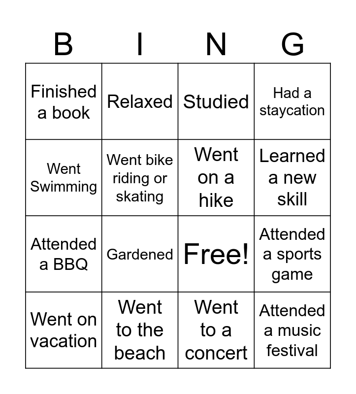 This bingo card has 16 words: Went to the beach, Attended a sports game, Studied, Finished a book, Attended a BBQ, Relaxed, Free!, Went to a concert, Went Swimming, Went bike riding or skating, Went on vacation, Had a staycation, Gardened, Learned a new skill, Went on a hike and Attended a music festival.