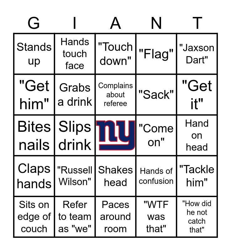 This bingo card has a free space and 29 words: Sits on edge of couch, "Let's go", Slips drink, Wearing team clothes, Stands up, "Touch down", Grabs a drink, "Russell Wilson", "Come on", Refer to team as "we", Hand on head, "How did he not catch that", Paces around room, "WTF was that", "Get it", "Run", Shakes head, Claps hands, "Jaxson Dart", Bites nails, Hands of confusion, "Watch this replay", "Sack", "Get him", "Flag", Hands touch face, "Tackle him", Complains about referee and "Sexy Dexy".