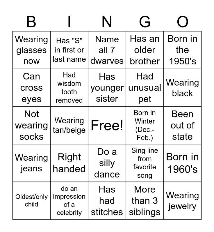 This bingo card has a free space and 24 words: Right handed, do an impression of a celebrity, Has younger sister, Oldest/only child, Born in the 1950's, Wearing glasses now, Can cross eyes, Has "S" in first or last name, Born in Winter (Dec.-Feb.), Do a silly dance, Had unusual pet, Not wearing socks, Sing line from favorite song, Born in 1960's, Had wisdom tooth removed, More than 3 siblings, Been out of state, Name all 7 dwarves, Wearing black, Wearing tan/beige, Wearing jewelry, Wearing jeans, Has an older brother and Has had stitches.