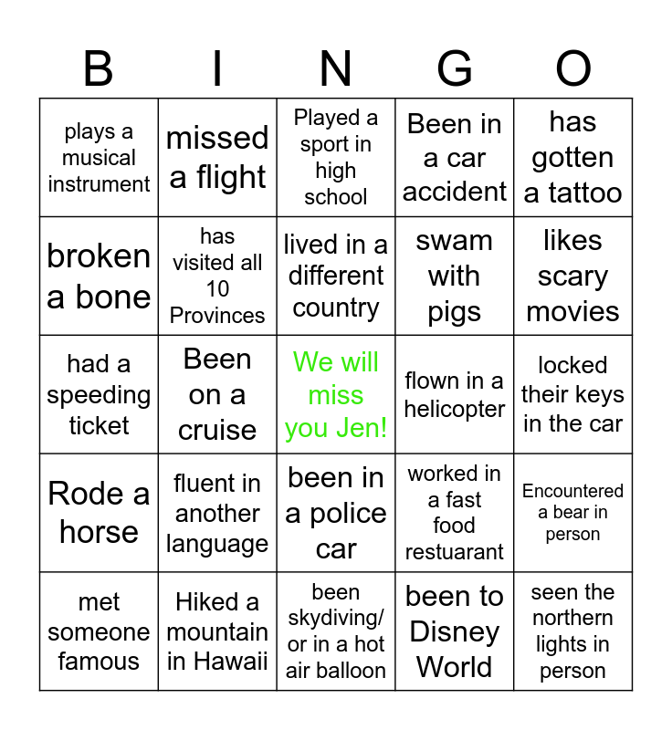 This bingo card has a free space and 24 words: fluent in another language, Hiked a mountain in Hawaii, lived in a different country, met someone famous, has gotten a tattoo, plays a musical instrument, broken a bone, missed a flight, flown in a helicopter, been in a police car, swam with pigs, had a speeding ticket, worked in a fast food restuarant, Encountered a bear in person, has visited all 10 Provinces, been to Disney World, locked their keys in the car, Played a sport in high school, likes scary movies, Been on a cruise, seen the northern lights in person, Rode a horse, Been in a car accident and been skydiving/ or in a hot air balloon.