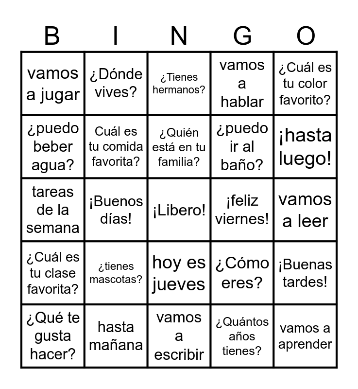 This bingo card has a free space and 34 words: ¿Cómo te llamas?, ¿Quántos años tienes?, ¿De dónde eres?, ¿Cómo eres?, ¿Cuál es tu clase favorita?, Cuál es tu comida favorita?, ¿Cuál es tu color favorito?, ¿Qué te gusta hacer?, ¿Dónde vives?, ¿quién es tu mejor amigo?, ¿Quién está en tu familia?, ¿Tienes hermanos?, hoy es lunes, hoy es miércoles, ¡feliz viernes!, ¡hasta luego!, hasta mañana, tareas de la semana, ¿tienes mascotas?, ¿Cómo eres?, hoy es jueves, hoy es martes, vamos a jugar, vamos a leer, vamos a escribir, vamos a aprender, vamos a hablar, ¿hablas español?, ¿puedo ir al baño?, ¿puedo beber agua?, ¡Qué tengas un buen día!, ¡Buenos días!, ¡Buenas tardes! and ¿Dónde está la profe?.
