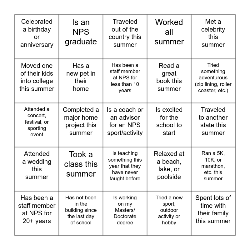 This bingo card has 25 words: Took a class this summer, Is working on my Masters/ Doctorate degree, Has been a staff member at NPS for less than 10 years, Has been a staff member at NPS for 20+ years, Met a celebrity this summer, Celebrated a birthday or anniversary, Moved one of their kids into college this summer, Is an NPS graduate, Is excited for the school to start, Is teaching something this year that they have never taught before, Read a great book this summer, Attended a concert, festival, or sporting event, Relaxed at a beach, lake, or poolside, Ran a 5K, 10K, or marathon, etc. this summer, Has a new pet in their home, Spent lots of time with their family this summer, Traveled to another state this summer, Traveled out of the country this summer, Tried something adventurous (zip lining, roller coaster, etc.), Completed a major home project this summer, Is a coach or an advisor for an NPS sport/activity, Has not been in the building since the last day of school, Attended a wedding this summer, Worked all summer and Tried a new sport, outdoor activity or hobby.
