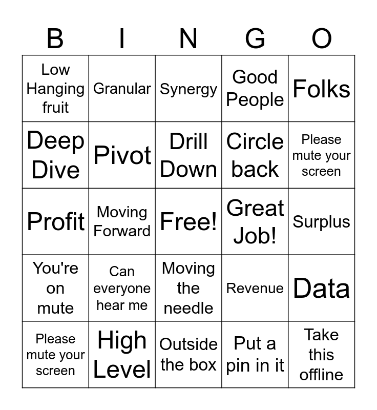 This bingo card has a free space and 29 words: Please mute your screen, Layoff, Moving Forward, Super Excited, Low Hanging fruit, Synergy, Pivot, Can everyone hear me, Great Job!, High Level, Surplus, Take this offline, Outside the box, Put a pin in it, Please mute your screen, Let people go, Moving the needle, You're on mute, Folks, Profit, Revenue, Can everyone see my screen, Circle back, Deep Dive, Good People, Granular, Data, Drill Down and Utilization.