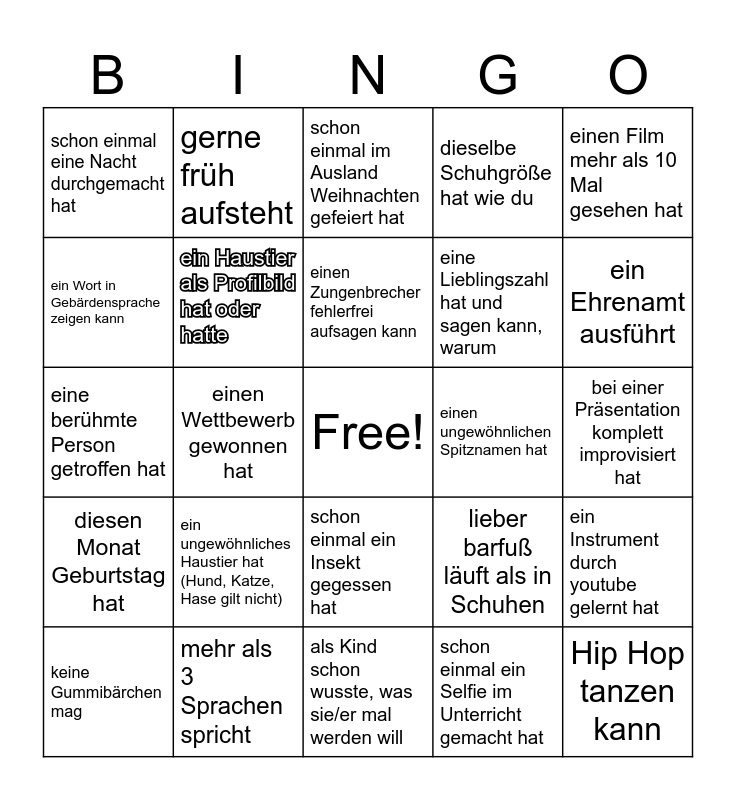 This bingo card has a free space and 24 words: ein ungewöhnliches Haustier hat (Hund, Katze, Hase gilt nicht), mehr als 3 Sprachen spricht, einen Zungenbrecher fehlerfrei aufsagen kann, keine Gummibärchen mag, einen Film mehr als 10 Mal gesehen hat, schon einmal eine Nacht durchgemacht hat, ein Wort in Gebärdensprache zeigen kann, gerne früh aufsteht, einen ungewöhnlichen Spitznamen hat, schon einmal ein Insekt gegessen hat, eine Lieblingszahl hat und sagen kann, warum, eine berühmte Person getroffen hat, lieber barfuß läuft als in Schuhen, ein Instrument durch youtube gelernt hat, ein Haustier als Profilbild hat oder hatte, schon einmal ein Selfie im Unterricht gemacht hat, bei einer Präsentation komplett improvisiert hat, schon einmal im Ausland Weihnachten gefeiert hat, ein Ehrenamt ausführt, einen Wettbewerb gewonnen hat, Hip Hop tanzen kann, diesen Monat Geburtstag hat, dieselbe Schuhgröße hat wie du and als Kind schon wusste, was sie/er mal werden will.