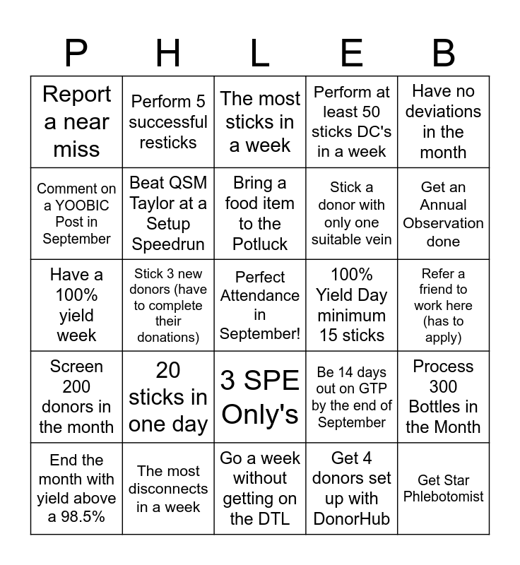 This bingo card has a free space and 24 words: 20 sticks in one day, The most disconnects in a week, Bring a food item to the Potluck, End the month with yield above a 98.5%, Have no deviations in the month, Report a near miss, Comment on a YOOBIC Post in September, Perform 5 successful resticks, 100% Yield Day minimum 15 sticks, 3 SPE Only's, Stick a donor with only one suitable vein, Have a 100% yield week, Be 14 days out on GTP by the end of September, Process 300 Bottles in the Month, Beat QSM Taylor at a Setup Speedrun, Get 4 donors set up with DonorHub, Refer a friend to work here (has to apply), The most sticks in a week, Get an Annual Observation done, Stick 3 new donors (have to complete their donations), Get Star Phlebotomist, Screen 200 donors in the month, Perform at least 50 sticks DC's in a week and Go a week without getting on the DTL.