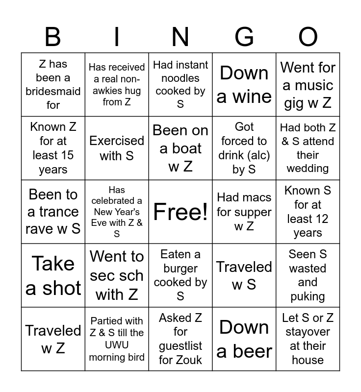 This bingo card has a free space and 25 words: Went to sec sch with Z, Asked Z for guestlist for Zouk, Been on a boat w Z, Traveled w Z, Went for a music gig w Z, Z has been a bridesmaid for, Known Z for at least 15 years, Has received a real non-awkies hug from Z, Had macs for supper w Z, Eaten a burger cooked by S, Got forced to drink (alc) by S, Been to a trance rave w S, Traveled w S, Seen S wasted and puking, Exercised with S, S has been a grooms/bridesman for, Known S for at least 12 years, Had instant noodles cooked by S, Had both Z & S attend their wedding, Has celebrated a New Year's Eve with Z & S, Let S or Z stayover at their house, Partied with Z & S till the UWU morning bird, Take a shot, Down a wine and Down a beer.