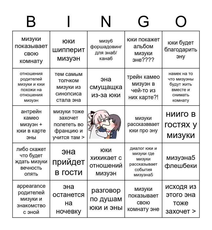 This bingo card has a free space and 24 words: эна прийдет в гости, эна останется на ночевку, эна смущащка из-за юки, appearance родителей мизуки и знакомство с эной, юки будет благодарить эну, мизуки показывает свою комнату, отношения родителей мизуки и юки похожи на отношения мизуэн, юки шипперит мизуэн, мизуки рассказввает юки про эну, юки хихикает с отношений мизуэн, трейн камео мизуэн в чей-то из них карте?!, антрейн камео мизуэн + юки в карте эны, диалог юки и мизуки где мизуки рассказывает события мизуэна5, мизуэна5 флешбеки, тем самым толчком мизуки из синопсиса стала эна, мизуки показывает свою комнату эне, нииго в гостях у мизуки, мизу6 форшадовинг для эна6/кана6, намек на то что мизуэны будут жить вместе и снимать комнату, мизуки тоже захочет полететь во францию и учится там >, исходя из этого эна тоже захочет >, либо скажет что будет ждать мизуки вечность опять, юки покажет альбом мизуки эне???? and разговор по душам юки и эны.