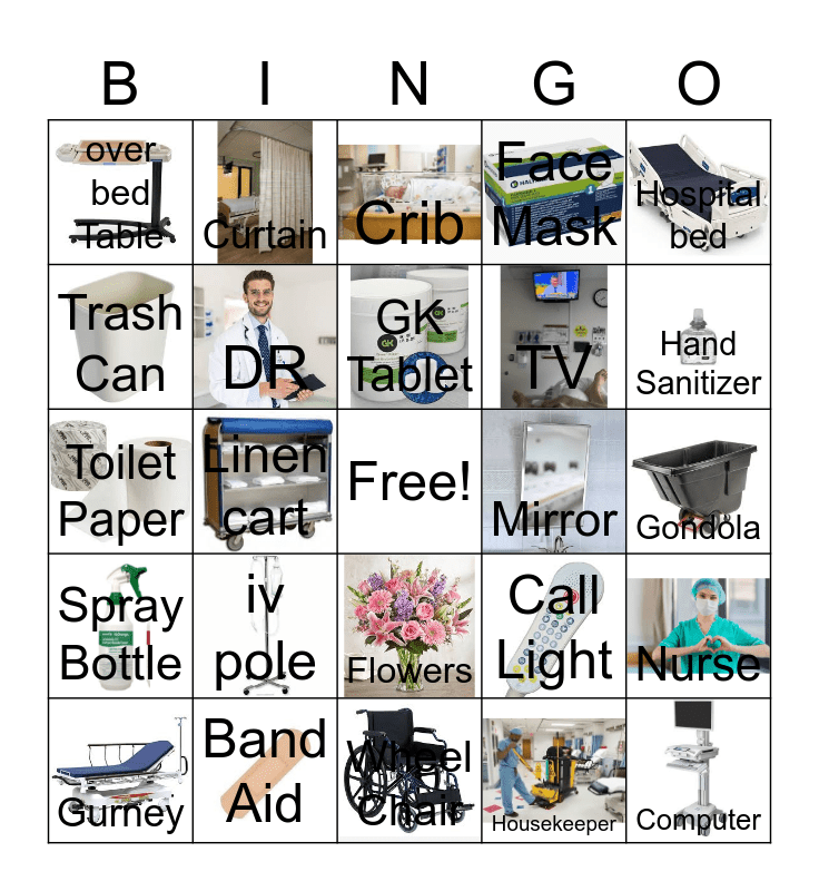 This bingo card has 24 images, a free space and 24 words: iv pole, Band Aid, GK Tablet, Gurney, Hospital bed, over bed Table, Trash Can, Curtain, Mirror, Flowers, TV, Toilet Paper, Call Light, Nurse, DR, Housekeeper, Gondola, Crib, Hand Sanitizer, Linen cart, Computer, Spray Bottle, Face Mask and Wheel Chair.