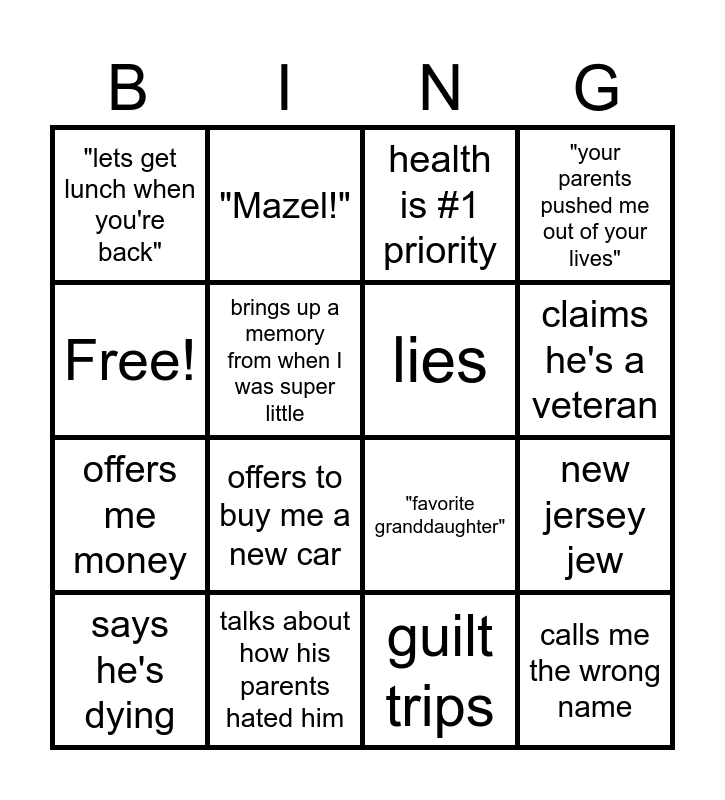 This bingo card has 16 words: talks about how his parents hated him, new jersey jew, health is #1 priority, "lets get lunch when you're back", offers me money, "Mazel!", "favorite granddaughter", guilt trips, Free!, brings up a memory from when I was super little, says he's dying, "your parents pushed me out of your lives", offers to buy me a new car, claims he's a veteran, lies and calls me the wrong name.