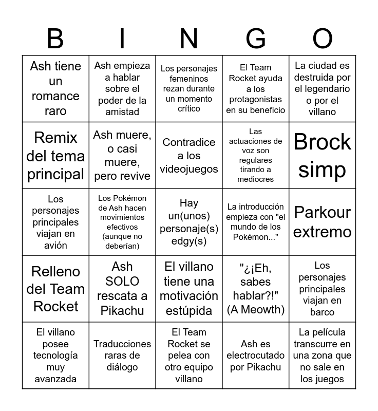 This bingo card has a free space and 54 words: Ash plot armour, Relleno del Team Rocket, Fanservice de legendarios, El ritmo de la película es inconsistente, El villano tiene una motivación estúpida, Ash se hace amigo de un legendario, El Team Rocket ayuda a los protagonistas en su beneficio, Fanservice furro, Remix del tema principal, "Los Pokémon son buenos, los humanos son malos", Ash tiene un romance raro, El Team Rocket resultan ser los buenos, Traducciones raras de diálogo, El villano posee tecnología muy avanzada, Un personaje principal a parte de Ash no tiene desarrollo, El Team Rocket se pelea con otro equipo villano, La película transcurre en una zona que no sale en los juegos, Las actuaciones de voz son regulares tirando a mediocres, El Pokémon legendario es el villano, pero se vuelve bueno, Parkour extremo, "¿¡Eh, sabes hablar?!" (A Meowth), Ocurre un desastre conveniente para la trama, La introducción empieza con "el mundo de los Pokémon...", La ciudad es destruida por el legendario o por el villano, Cancioncita cringe que no aporta nada, Ash empieza a hablar sobre el poder de la amistad, Escena cancelable, Por lo que sea los personajes femeninos son tóxicos, La guarida del villano es obvio CGI, Ash es electrocutado por Pikachu, Personaje waifu, No usar a los Pokémon en momentos críticos, Pikachu es el más inteligente del grupo, Hay un personaje con un portátil que puede hacer de todo, Los personajes femeninos rezan durante un momento crítico, Hay una nave espacial, Los personajes principales viajan en avión, Los personajes principales viajan en barco, Aparece el Charizard de Ash, Ash muere, o casi muere, pero revive, Meowth traduce a Pokémon, Hay un festival de algún tipo, El personaje nuevo es claramente el villano, El grupo principal se separa momentáneamente, Ash SOLO rescata a Pikachu, Alguien se tanquea una herida mortal, Error de animación, "¡Adelante, Pikachu!", Contradice a los videojuegos, Los Pokémon de Ash hacen movimientos efectivos (aunque no deberían), Brock simp, Aparece la enfermera Joy, "¡El Team Rocket despega de nuevo!" and Una chica le simpea a Ash, pero no se da cuenta.