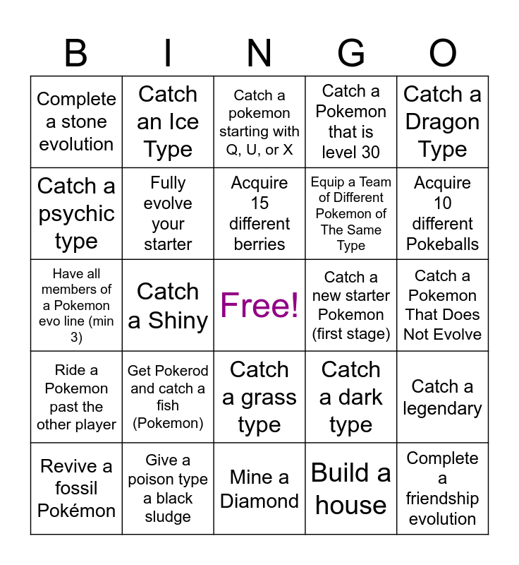 This bingo card has a free space and 24 words: Revive a fossil Pokémon, Get Pokerod and catch a fish (Pokemon), Acquire 15 different berries, Build a house, Catch a Dragon Type, Complete a stone evolution, Catch an Ice Type, Catch a pokemon starting with Q, U, or X, Catch a new starter Pokemon (first stage), Catch a Pokemon That Does Not Evolve, Have all members of a Pokemon evo line (min 3), Fully evolve your starter, Catch a dark type, Catch a legendary, Catch a psychic type, Give a poison type a black sludge, Mine a Diamond, Catch a Pokemon that is level 30, Acquire 10 different Pokeballs, Ride a Pokemon past the other player, Catch a Shiny, Catch a grass type, Equip a Team of Different Pokemon of The Same Type and Complete a friendship evolution.