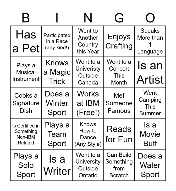This bingo card has a free space and 25 words: Plays a Team Sport, Went to a University Outside Ontario, Went to a Univeristy Outside Canada, Plays a Solo Sport, Speaks More than 1 Language, Has a Pet, Plays a Musical Instrument, Participated in a Race (any kind!), Met Someone Famous, Knows How to Dance (Any Style), Went to a Concert This Month, Cooks a Signature Dish, Reads for Fun, Is a Movie Buff, Knows a Magic Trick, Has a Collection, Went Camping This Summer, Went to Another Country this Year, Is an Artist, Does a Winter Sport, Does a Water Sport, Is a Writer, Is Certified in Something Non-IBM Related, Enjoys Crafting and Can Build Something from Scratch.