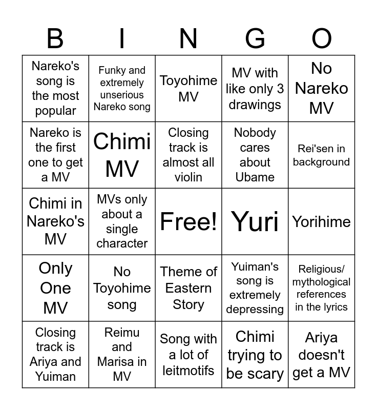 This bingo card has a free space and 24 words: No Toyohime song, Reimu and Marisa in MV, Closing track is almost all violin, Closing track is Ariya and Yuiman, No Nareko MV, Nareko's song is the most popular, Nareko is the first one to get a MV, Funky and extremely unserious Nareko song, Yuri, Theme of Eastern Story, Nobody cares about Ubame, Chimi in Nareko's MV, Yuiman's song is extremely depressing, Religious/ mythological references in the lyrics, Chimi MV, Chimi trying to be scary, Yorihime, Toyohime MV, Rei'sen in background, MVs only about a single character, Ariya doesn't get a MV, Only One MV, MV with like only 3 drawings and Song with a lot of leitmotifs.