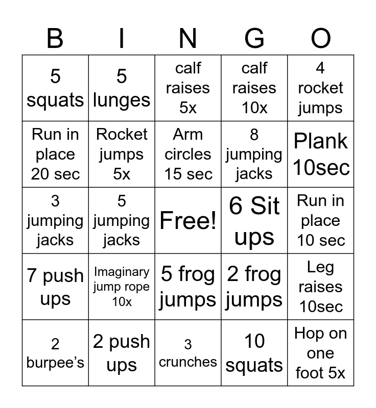 This bingo card has a free space and 29 words: 2 burpee’s, Hop on one foot 7x, 5 jumping jacks, 2 rocket jumps, 5 squats, calf raises 5x, Rocket jumps 5x, Imaginary jump rope 10x, 6 Sit ups, 2 push ups, Run in place 10 sec, Hop on one foot 5x, 3 crunches, 10 squats, Plank 10sec, 3 lunges, 5 frog jumps, 7 push ups, 4 rocket jumps, 3 jumping jacks, 2 frog jumps, 5 push ups, 8 jumping jacks, Run in place 20 sec, calf raises 10x, 5 lunges, Leg raises 10sec, Arm circles 15 sec and Imaginary jump rope 15x.