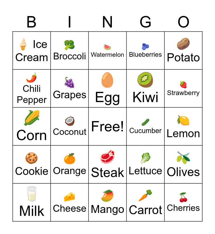 This bingo card has a free space and 34 words: 🍎 Apple, 🥕 Carrot, 🍌 Banana, 🍕 Pizza, 🍪 Cookie, 🍇 Grapes, 🥔 Potato, 🥛 Milk, 🥦 Broccoli, 🥑 Avocado, 🥚 Egg, 🍉 Watermelon, 🍍 Pineapple, 🐟 Fish, 🥒 Cucumber, 🍓 Strawberry, 🧀 Cheese, 🌽 Corn, 🍊 Orange, 🥬 Lettuce, 🥩 Steak, 🍞 Bread, 🍦 Ice Cream, 🍋 Lemon, 🥭 Mango, 🍒 Cherries, 🫐 Blueberries, 🍐 Pear, 🥝 Kiwi, 🌶️ Chili Pepper, 🫑 Bell Pepper, 🥥 Coconut, 🫒 Olives and 🧅 Onion.