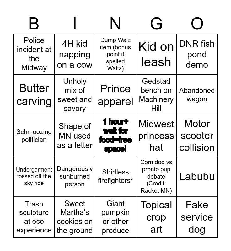 This bingo card has a free space and 24 words: Dangerously sunburned person, Sweet Martha's cookies on the ground, Prince apparel, Trash sculpture at eco experience, DNR fish pond demo, Police incident at the Midway, Butter carving, 4H kid napping on a cow, Midwest princess hat, Shirtless firefighters*, Gedstad bench on Machinery Hill, Schmoozing politician, Corn dog vs pronto pup debate (Credit: Racket MN), Labubu, Unholy mix of sweet and savory, Topical crop art, Motor scooter collision, Dump Walz item (bonus point if spelled Waltz), Abandoned wagon, Shape of MN used as a letter, Fake service dog, Undergarment tossed off the sky ride, Kid on leash and Giant pumpkin or other produce.