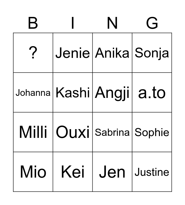 This bingo card has 16 words: Mio, Kei, Anika, Sonja, Johanna, Jenie, Sabrina, Sophie, ?, Kashi, Jen, a.to, Milli, Ouxi, Angji and Justine.