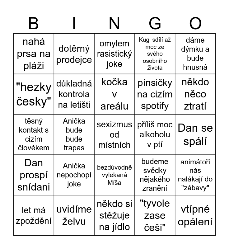 This bingo card has 30 words: uvidíme želvu, golfový vozík, Anička bude bude trapas, otravování z práce, nahá prsa na pláži, omylem rasistický joke, důkladná kontrola na letišti, bezdůvodně vylekaná Míša, příliš moc alkoholu v ptí, někdo si stěžuje na jídlo, Dan se spálí, sexizmus od místních, "tyvole zase češi", vtípné opálení, někdo něco ztratí, problém s hotelem, budeme svědky nějakého zranění, Dan prospí snídani, Anička nepochopí joke, dáme dýmku a bude hnusná, těsný kontakt s cizím člověkem, ručníky ve tvaru <3, dotěrný prodejce, pínsičky na cizím spotify, "hezky česky", Kugi sdílí až moc ze svého osobního života, animátoři nás nalákají do "zábavy", let má zpoždění, kočka v areálu and chybějící toalěťák.